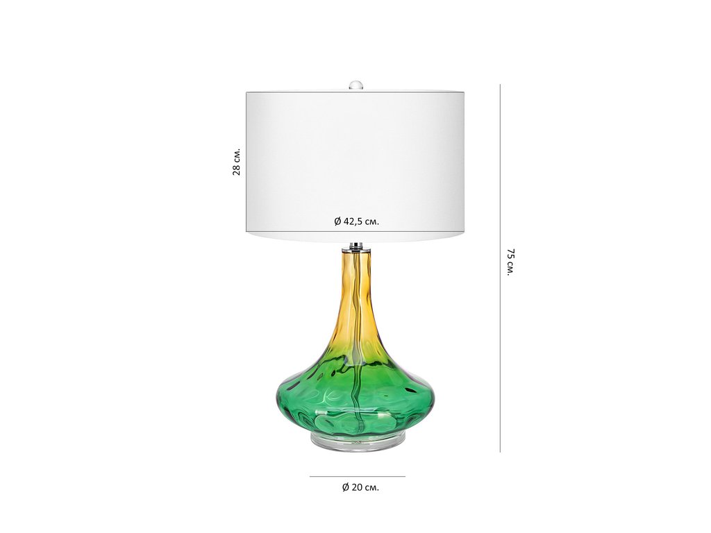 Настольная лампа “Кэндис” имеет форму винного декантера, с длинной сужающейся к верху горловиной и широким приплюснутым низом, создавая завершенный и сбалансированный образ. Выполненная в градуированном прозрачном стекле, она меняет свой цвет от желтого до зеленого, создавая игру теней и отражений на поверхности. Это создает настоящий визуальный эффект, который добавит яркие краски в ваш интерьер. Тип цоколя: E27. Мощность лампы: 60 Вт. Степень защиты: IP20. Длина провода: 1,4 м. Цвет провода: Прозрачный. Расположение переключателя: Провод. Тип переключателя: Вкл. / Выкл. Комплектация лампочками: Нет. Вес: 4,6 кг.