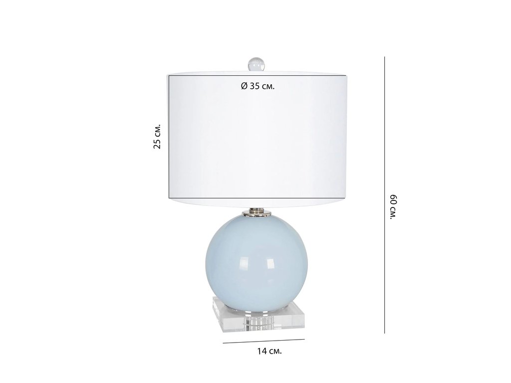 Настольная лампа “Вивиан” – это стеклянный шар окрашенный в небесный голубой цвет, который смонтирован на квадратной основе из хрусталя. Небольшой размер делает эту настольную лампу универсальной и подходит для самых разных помещений вашего дома. Тип цоколя: E14. Мощность лампы: 40 Вт. Степень защиты: IP20. Длина провода: 1,4 м. Цвет провода: Прозрачный. Расположение переключателя: Провод. Тип переключателя: Вкл. / Выкл. Комплектация лампочками: Нет.
